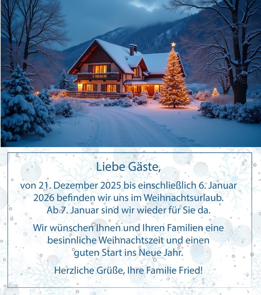 Wir, die Familie Fried, nehmen den Schutz Ihrer persönlichen Daten sehr ernst und halten uns strikt an die Regeln der Datenschutzgesetze. Die von Ihnen mitgeteilten personenbezogenen Daten werden von uns entsprechend der Bestimmungen des Bundesdatenschutzgesetzes und des Telemediengesetzes erhoben, gespeichert und genutzt.